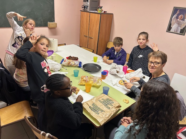 Nous avons poursuivi au centre paroissial où les groupes se sont séparés dans 4 salles différentes. Pendant ce temps, les parents ont constitué un groupe spécifique autour du Père Joseph qui leur a fait un enseignement sur le Notre Père. Ce temps de catéchèse et d’échange a fini par le temps convivial du repas partagé.